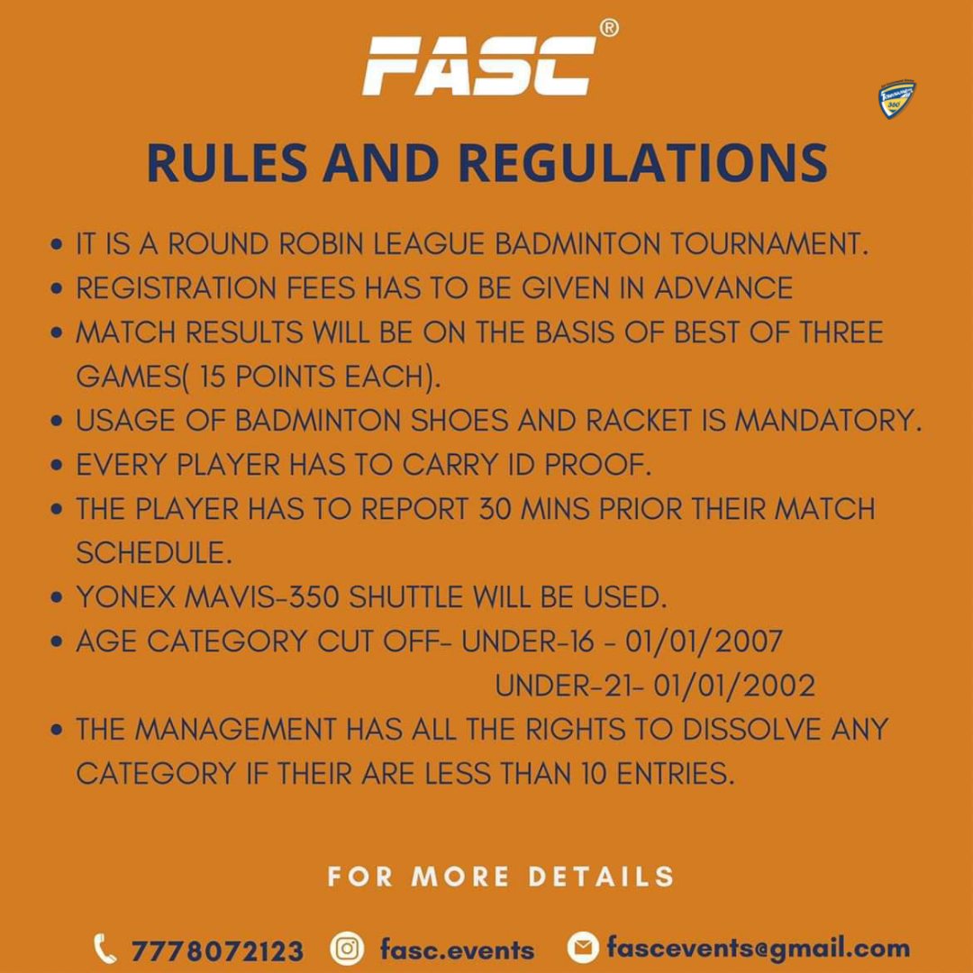 FASC Events conducting Badminton Tournament for Boys and Girls. The tournament held on 18th September 2022. Held at Ahemdabad, Gujarat.