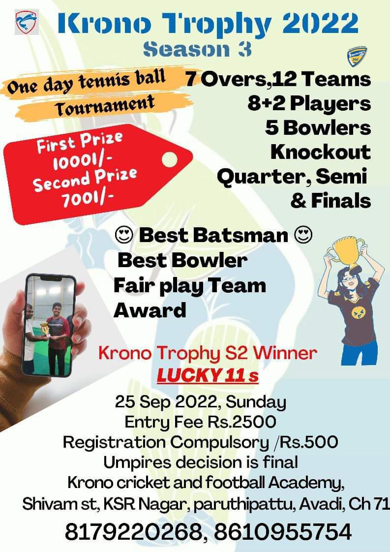 25th Sep 2022 Tournaments360 ChennaiKrono Cricket and Football Academy conducting Krono Trophy 2022 Season 3 One Day Tennis Ball Cricket...